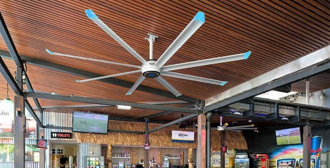 Qua đó ta thấy được quạt trần công nghiệp sải cánh dài được lắp đặt ở trên cao, gió được lan tỏa ra nhiều hướng giúp làm mát không gian một cách tự nhiên, dịu dàng và liên tục. Đặc biệt khi kết hợp hệ thống điều hòa kèm quạt trần làm mát sẽ cho hiệu quả làm mát cao trong một diện tích lớn.