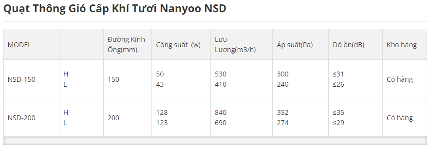 Thông số kỹ thuật dòng quạt cấp khí tươi Nanyoo NSD