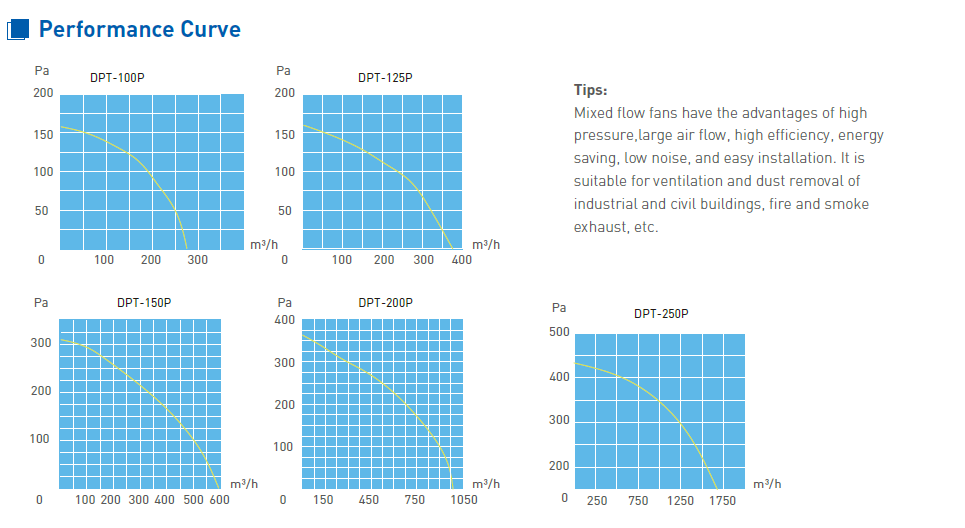 Quạt lưu lượng hỗn hợp DPT-125P có ưu điểm vượt trội về áp suất cao, lưu lượng không khí lớn, hiệu suất cao, tiết kiệm năng lượng, tiếng ồn thấp và dễ lắp đặt. Chúng phù hợp để thông gió và loại bỏ bụi trong các công trình công nghiệp và dân dụng, xả khói và khí cháy